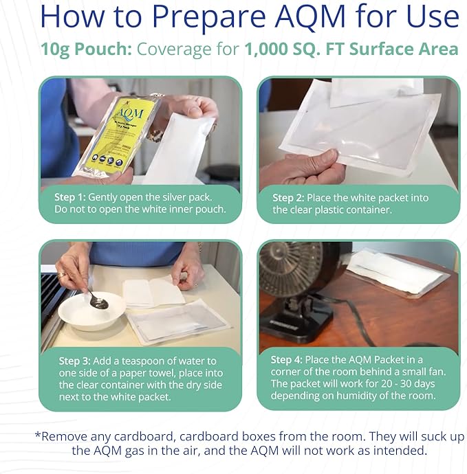 - How to Use: Place the AQM Packet in a corner of the room and open the silver packet; Remove the white pouch and place it back into the clear, self-adhesive protector; Place a slightly moistened paper towel in the protector, then place the protector pack behind a small 4โณ diameter fan; The room will be completely deodorized and the packet can produce the gas up to 20-30 days; Depending on the odor, the smell could be gone for years