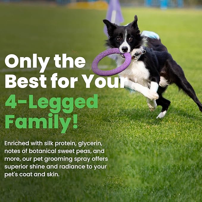 - Carefully Crafted: Enriched with essential ingredients like silk protein and glycerin along with the notes of botanical sweet peas, our pet grooming spray offers superior shine and radiance to your pet's soft coat and fur.