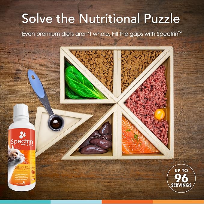 - Nusentia's full spectrum liquid feline multivitamin: Spectrin for Cats : Best Value per Ounce! Includes antioxidants, vitamins, minerals, and key nutrients for vibrant skin, coat, and allergy support. Great for excessive shedding and allergies in cats.