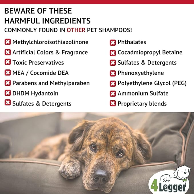 - THE CHOICE FOR ECO-CONSCIOUS PET PARENTS: 4-Legger dog shampoo is made from sustainably sourced, all natural ingredients. Our goal is to help our furry family members live longer lives through natural products, and reduce the environmental impact of toxins in pet grooming products
