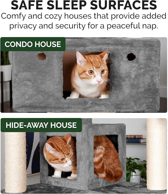 - FUN AND PLAY: The tall cat tree tower playground features plenty of activities and entertainment to keep your cat engaged and mentally stimulated, such as sisal posts, plush ball toys, a prey toy, a hanging rope, and an interactive cat IQ busy box
