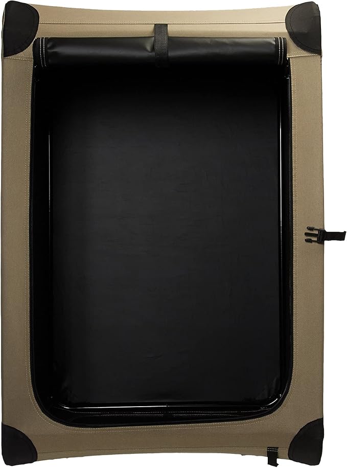 - Soft-sided dog crate for keeping a furry 4-legged friend safe and comfortable when traveling, includes a Small dog crate made of tan polyester fabric and a lightweight yet sturdy frame