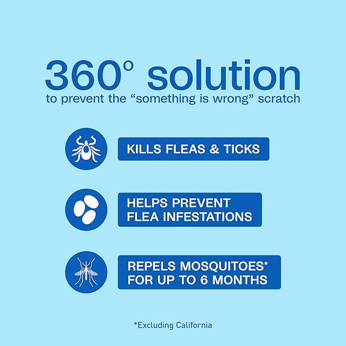 - EFFECTIVE FLEA & TICK TREATMENT: Kills fleas and ticks including deer ticks and prevents new flea infestations while repelling mosquitoes* for 6 months. (*Excluding California)