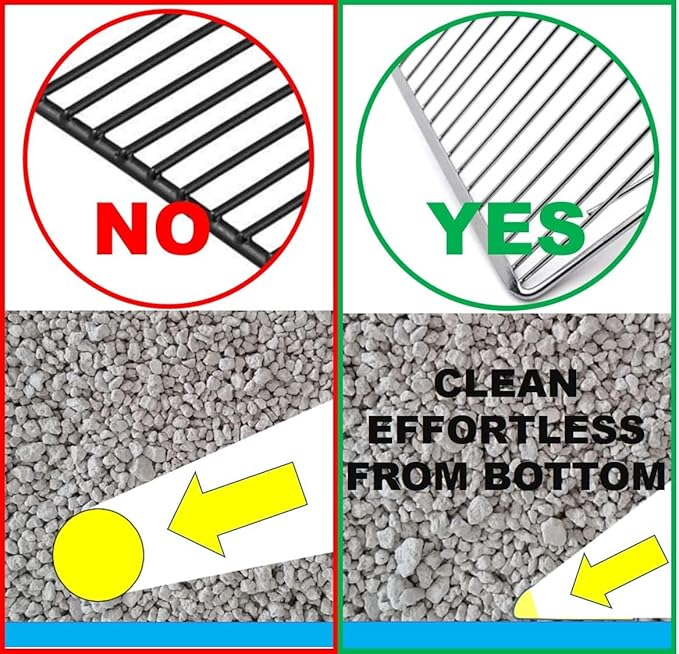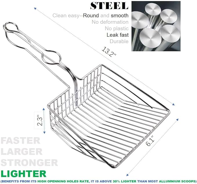 - 👍 【FAST metal litter scooper】 Made of ROUND and smooth stainless steel wires, NO stuck and LESS sticky, stays clean and easy to clean. The large deep shoveled metal cat scooper works with clumping cat litter like a breeze, fast and fun. NO shaking and shaking, NO clumps breaking, and for sure it will reduce dust and odor inhalation for health.