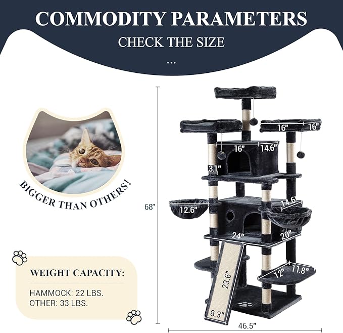 - Solid and Stable: The cat tree is made of marvelous particle board with skin-friendly plush covering, the strengthened base is strong enough to support 44 lb