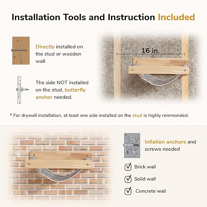 - Save Space - The cat wall furniture has ideal size for most cats to sleep or have a nap, its wall mounted design fully use vertical space. In the limited home space, leaving room for cats to rest and play.