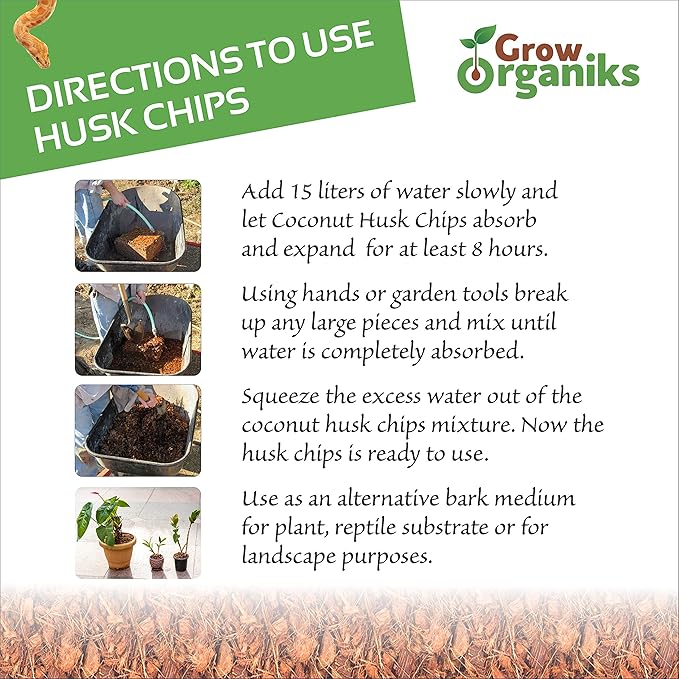 - [๐100% Natural & Biodegradable] Grow Organiks Coconut Husk chips are cut pieces of the husk of the coconut compressed into 11 lbs.Coconut husks are a sustainable alternative to other mulches. Our Organic coco chips are best suitable for growing plants, and also perfect for reptile substrate.