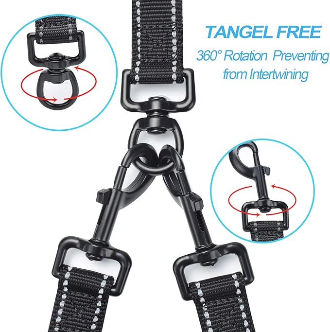 - No Tangle Double Dog Leash: 360° swivel clasps help to keep your dogs from getting tangled together. No need to worry about getting twisted two dog leash when dogs switch sides