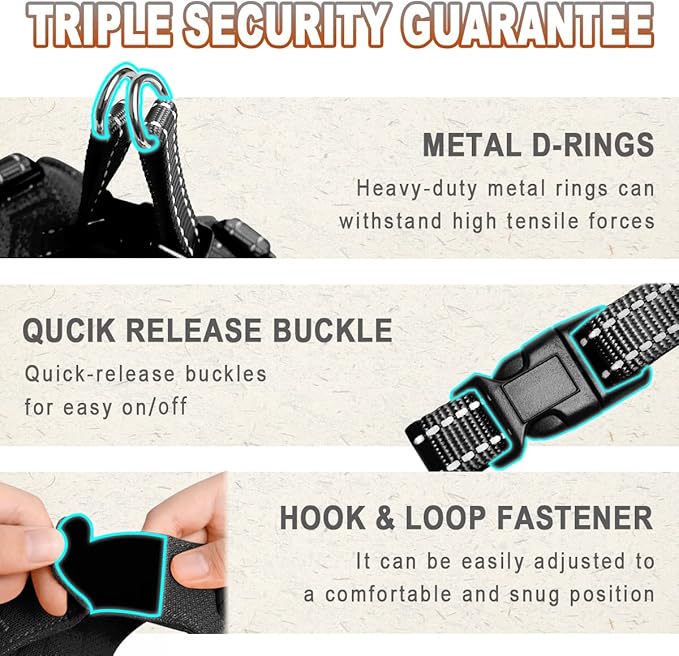 - Safety Guarantee :3 layers of security, the Hook and loop panel on the back works with a buckle and two D rings to keep your pet secure. 3M Reflective ensure him is highly visible and safe at night.