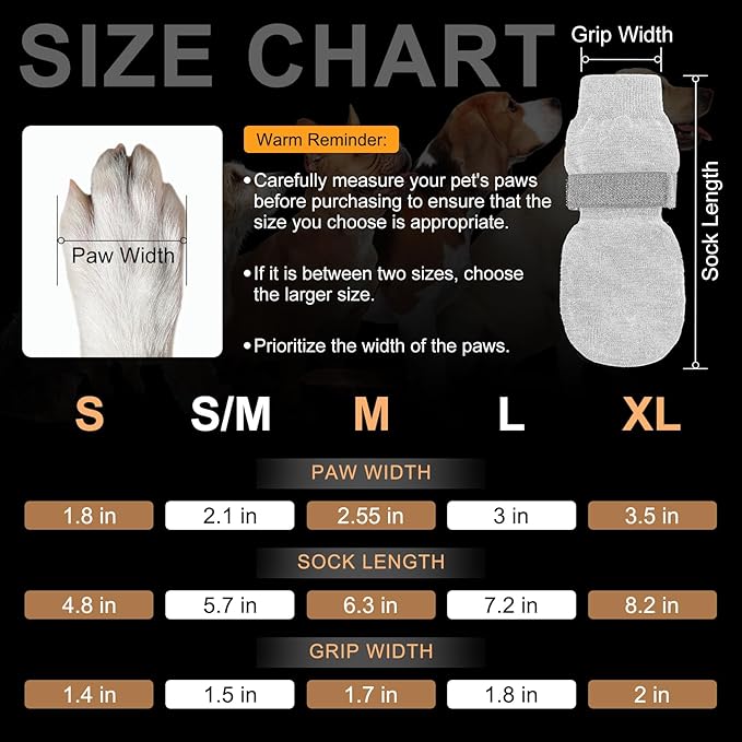 - Dog Socks Size Large: Grip Width 1.7",Paw Width 2.9", Length 7.3". Please measure your pet before purchase, if your size is between the two sizes, it's better to choose the smaller size. Because our pet paw protector socks are fabrics with elasticity. (Measurement method: let your dog step on a piece of paper and draw the outline of the paw. Measure the width of the claw and choose size. Note: make sure your dog is on paper instead of putting your paws on the paper at will.)