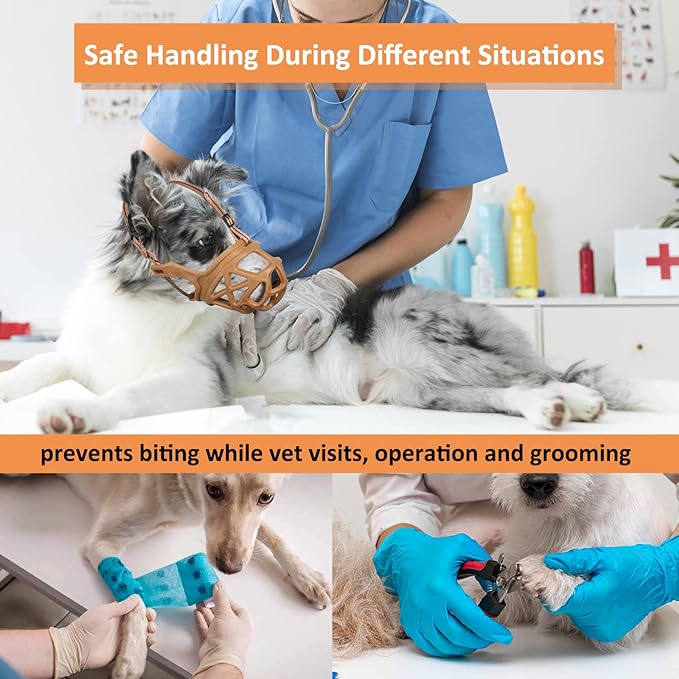 - The Only Muzzle You Need: Say goodbye to your old muzzle. The BARKLESS practical muzzle has features you need to prevent your dog from nipping, destroying, fighting and digging and eating everything while the basket-style design gives all-around mouth protection allowing your pet unrestricted drinking and panting. This muzzle for dogs make it the ideal choice for reactive dogsโ daily walks, occasional use, dog park socialization, grooming, vet visits, training, traveling, and walking