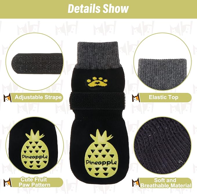 - Durable Material: Made of elastic and comfortable material, which keeps your dog safe and relaxed. The soft and breathable fabric makes these socks protect the dogโs paws from being burned in the hot summer and prevent dog claws from stones and glass. Cute fruit pattern even makes your dog look charming.