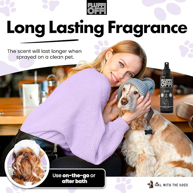 - RECOMMENDED BY GIRL WITH THE DOGS. FLUFF OFF! pet cologne spray for dogs is highly recommended by professional groomer and social media influencer Girl With The Dogs. Also used as cat cologne, our dog freshener body spray will leave your furry friend smelling fresh and feeling great.