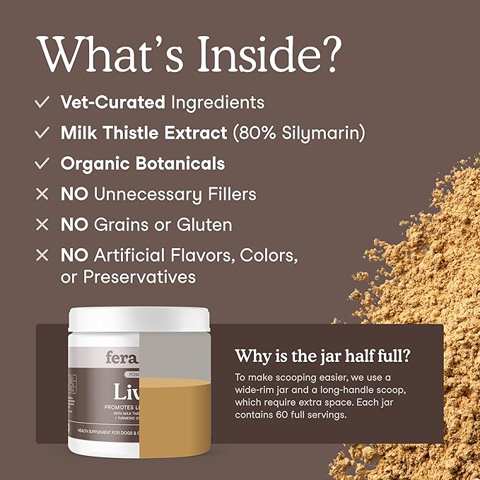 Fera Pets Liver Supplement for Dogs & Cats with Milk Thistle, Choline & Turmeric - Organic Botanicals - Enhances Liver Function, Immunity, Detoxification, & Metabolic Function - Powder - 60 Scoops