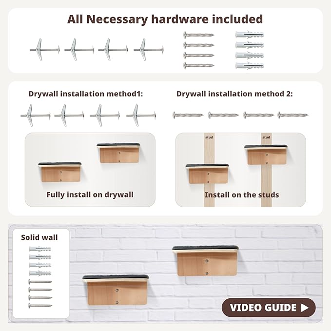 - Easy to Install - Our cat wall perch package includes instructions, screws, drywall anchors, and more. We've simplified the installation process, so you can have your cat furniture up in just 5 minutes.