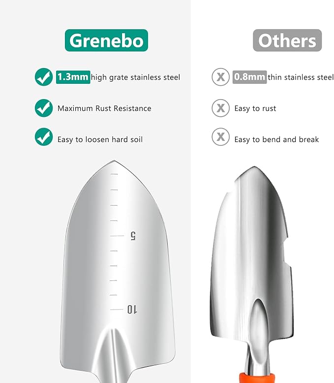 - Premium Product Quality: Made of high-strength SK-5 carbon steel, this stainless steel gardening tools is durable and rust-proof. Moreover, with high-performance material like this, these gardening tools are hardly deformed.
