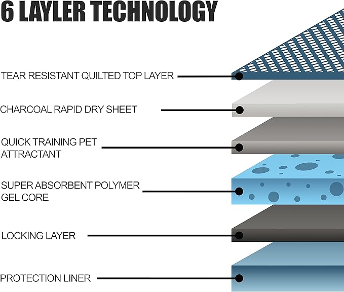 - LEAK-PROOF 6-LAYER DESIGN WITH ACTIVATED CHARCOAL: These dog pads feature a charcoal rapid dry sheet that quickly locks in moisture and neutralizes odors. Combined with a waterproof liner, the multi-layer system prevents leaks and keeps your home clean and fresh.