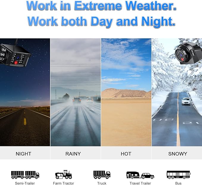 - Easy to install & After-Sale Service: The voltage range is DC12-24V, suitable for various large vehicles such as RV/Camper/5th Wheel Trailer/Bus/Van/Pickup/Farm Machinery. There is no cable between the monitor and the camera, very easy to install. If you find any defect or need help, please contact us. We are online 24 hours and provide 24 months replacement support and lifetime after-sales service.