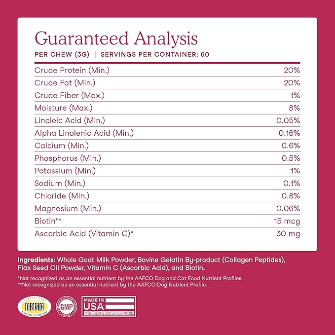 - Veterinarian formulated: Collagen for dogs and cats crafted by our Co-Founder, Veterinarian Dr. Dulake; dog and cat skin and coat supplement bears the NASC quality seal, is made in the USA, GMP-compliant, and does not contain colors, dyes or preservatives