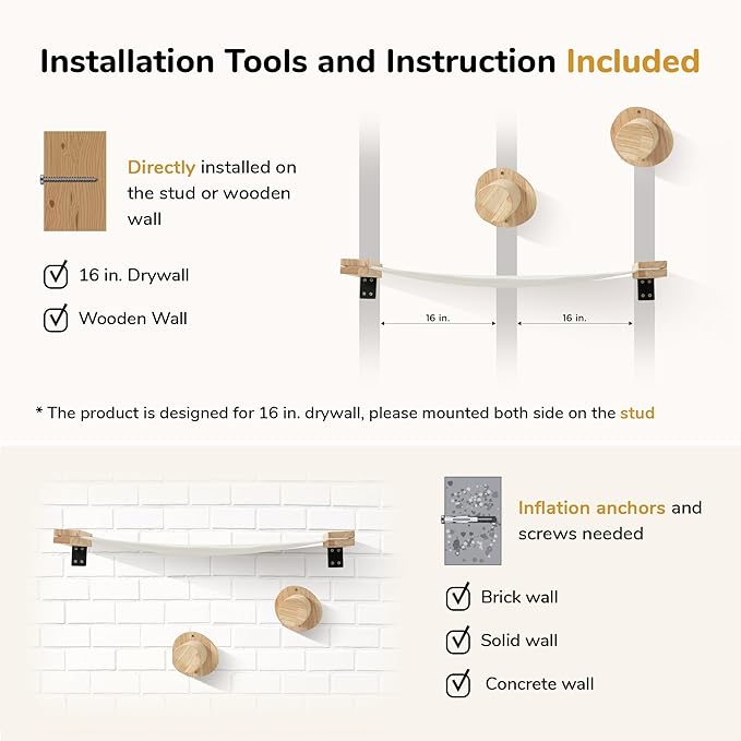 - Premium Design - For most family, drywall is supported behind by 16 in spacing wood stud, the cat perch and wall ladders are designed to ensure at least one side can be installed on the stud, maximum stability.