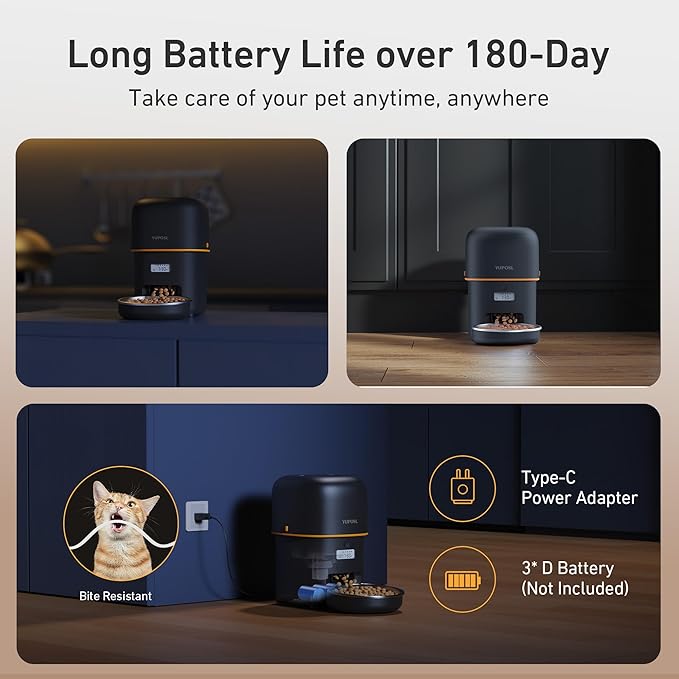 - Dual Power Supply: Our auto pet feeder powered by 3 D-size alkaline batteries (Not Included) can provide more than 180 days of using, allowing you to easily place it anywhere in the room, and you can fully escape from hassle of messy cables. Of course feeder also supports wall power supply, giving you full flexibility and convenience.