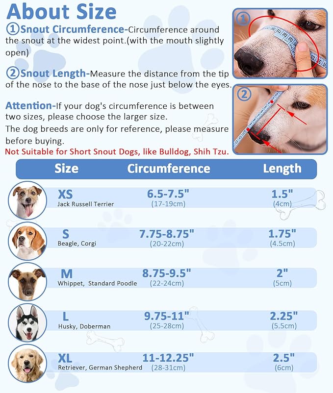 - Dog Muzzle for Small Dogs: Size S fits for dogs with snout circumference between 7.75"-8.75", and snout length longer than 1.75". The dog muzzle is suitable for Beagles, Corgi, etc. Note: ①Measure your dog's snout datas as shown in the size chart or the video before choosing the size(The snout circumference is the key to choose sizes). ②If between sizes, SIZE UP! ③Not suitable for aggressive dogs, highly anxious dogs, short-snout dogs, flat face dogs