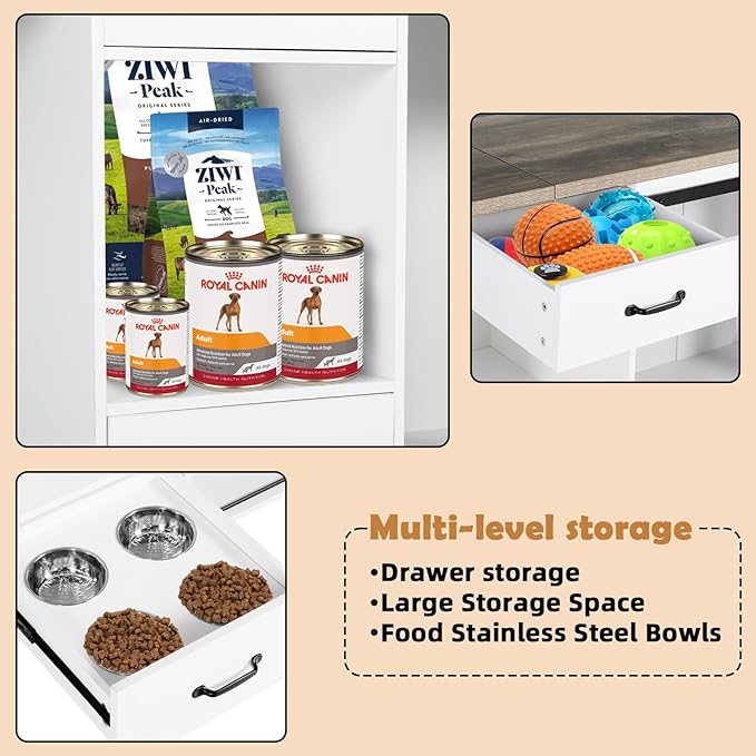 - Practical Design & Thoughtful Details - Our indoor dog house furniture has one drawer, one drawer feeder with 4 bowls and a big storage room for extra storage space. You can place pet supplies in it for easy use at any time. Also, the wide top perfect for magazines, family photos, favorite books, lamps, or other decorative items. With its double door latches, our dog crate furniture ensures that your dogs won't easily escape you're away.