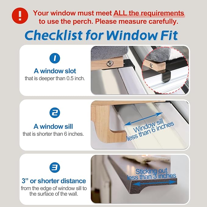 - 【No Suction Cups or Drilling Needed】 Ensure your window has a SLOT at least 0.5 inches deep for the perch to hook onto (hook thickness: 0.08 inch). The bracket is widely adjustable to fit various setups, with a maximum window sill depth of 9 inches.