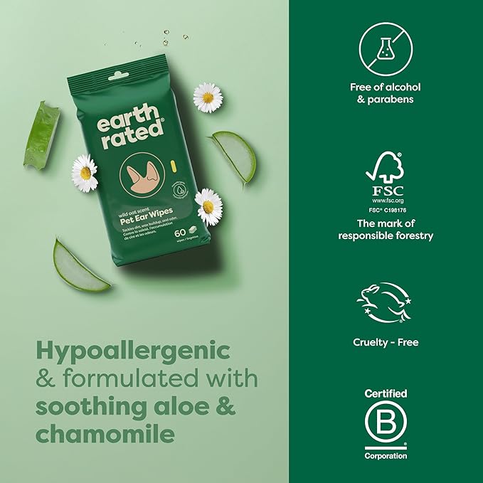 Earth Rated Vet-Developed Pet Ear Wipes, Hypoallergenic Cleaner for Dogs & Cats Ears to Remove Dirt and Wax Build Up, Wild Oat Scent, 70 Count