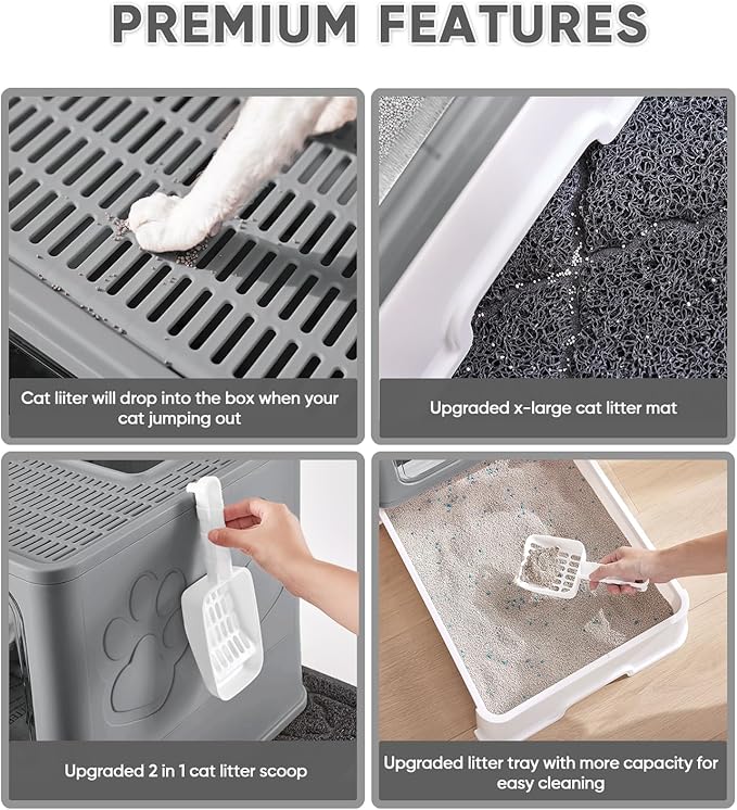 Cat Litter Box with X-Large Litter Mat and Scoop, Large Foldable Litter Box with Lid, Enclosed Kitty Box,Front Top Entry Exit, Odor Control Easy to Clean (Upgrade Dark Grey)