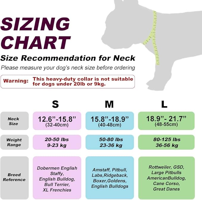 - Metal Collar for Dogs: The dog collars for small dogs with 4 adjustable points, easy to adjust the comfortable fit and attach to dog leash or dog collar. Please follow the size chart to measure your dog carefully before purchasing to ensure the collar is fit well to your dog. For dog neck (L: 18.9โ-21.7โ, M: 15.8โ-18.9โ, S: 12.6โ-15.8โ)