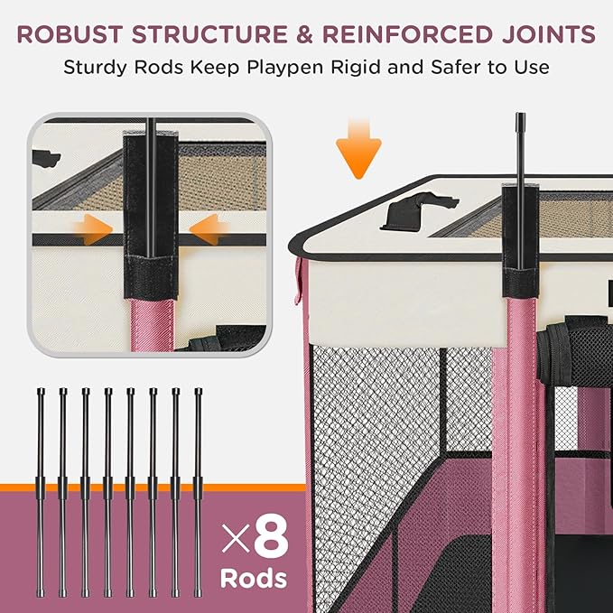 - Safety & Durability: Kitten playpen is made of high-quality 600D Oxford cloth, which is wear-resistant, soft to the touch, and odorless. We have reinforced the joints and corners of the dog playpen to ensure the safety of your pet. (The portable pet playpen is lightweight, and you can place heavy objects inside the pet playpen to increase stability, but it is not suitable for use with aggressive pets)