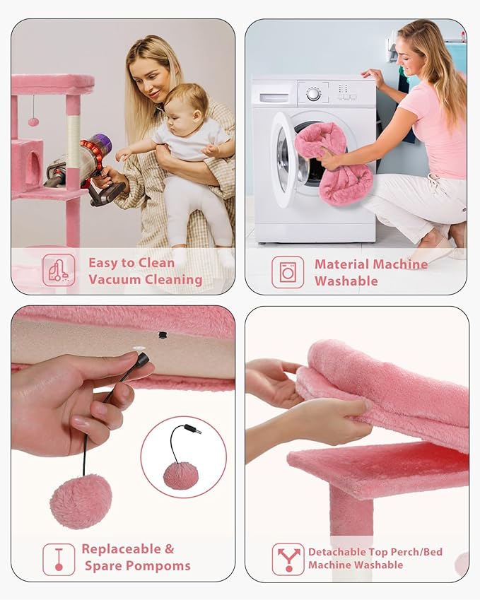 - Easy to clean: The detachable top perch is machine washabled and dried, and the whole cat tree is covered with faux-fur can bed easily cleaned by any vacuum cleanner.