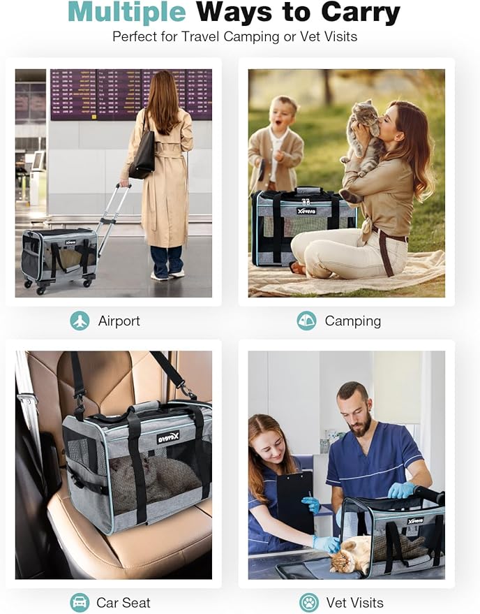 - Easy to Transport: The built-in telescopic trolley handle and easy swivel wheels make it convenient for travelers walking through airports. The rolling cat carrier also features a carrying strap and adjustable shoulder strap for easy pulling and pushing.