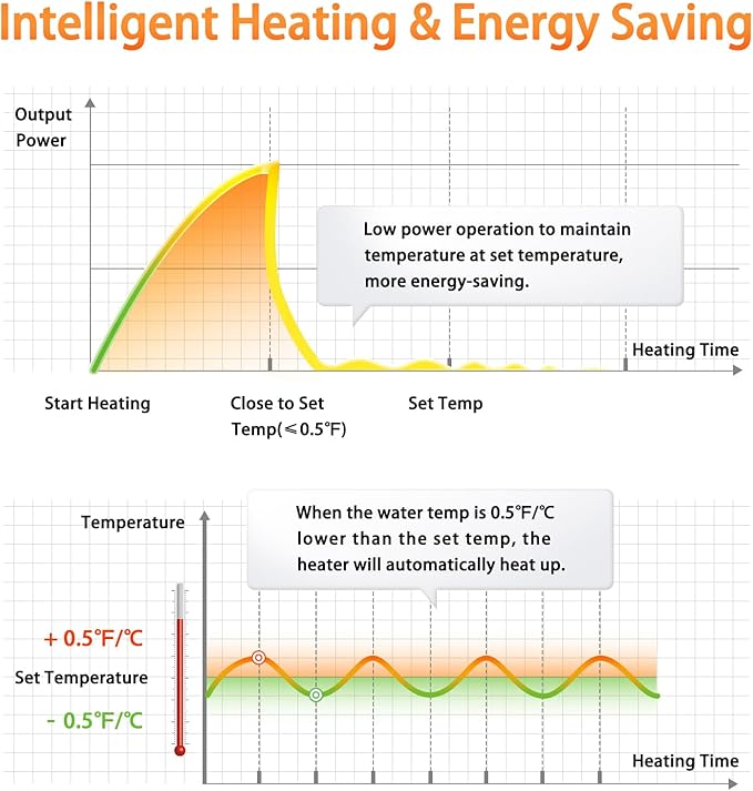 - Intelligent Heating & Energy-Saving: AQQA fish tank heater adopts automatic constant temperature heating, when the water temperature is lower than the set temperature, it will automatically warm up. When the water temperature reaches the set temperature, the heater will run at low power to maintain the water temperature within 0.5℉ difference from the set temperature; AQQA aquarium heater can reduce your electricity bill by 45% compared with traditional heaters