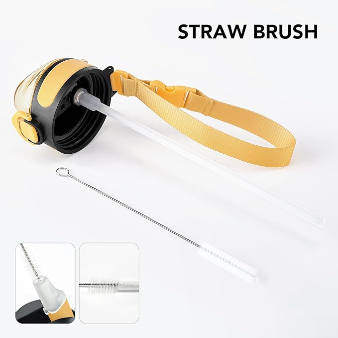 - Humanized Design: The one-hand operation button allows for easy access to water. Highly suitable for boys and girls, and all ages. The flip-top lid of the insulated bottle is used a secure lock, making it dust-free and leak-proof. The included straw brush makes maintaining your bottle's cleanliness uncomplicated and efficient.
