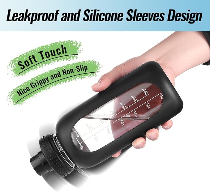 - WIDE MOUTH WATER BOTTLE: our 64 oz glass water bottle makes you easy to add ice cubes, tea bags, juicing or smoothies, also easy to clean it, food-grade silicone sleeve adds the glass tumbler a soft touch, nicely grippy and non-slip, it will be your perfect everyday companion