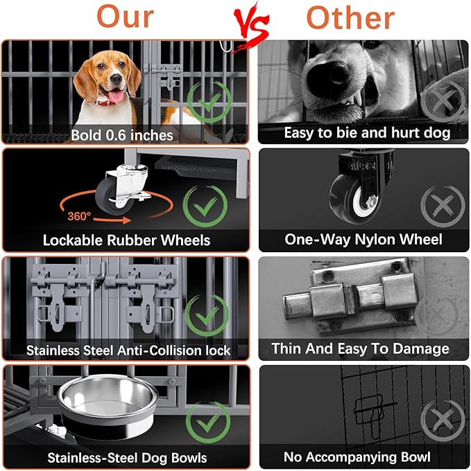 - γPractical & Easy to Move and CleanγThe dog crate comes with four smooth rolling locking wheels for easy movement and fixation, you can easily move the crate to different positions as needed. The dog crate comes with a pull-out tray for easy removal and cleaning. It also comes with a safety latch to avoid your smart dog from opening the iron door, effectively protect your pet.