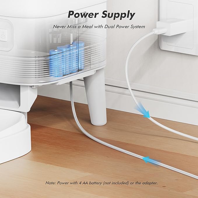 - Dual Power Supply: Powered by either a Type-C adapter or 4 AA batteries (not included), this automatic feeder keeps meals coming even during power outagesโso your pet never goes hungry. It also includes a durable, chew-resistant 1.5-meter nylon cable for flexible and worry-free placement