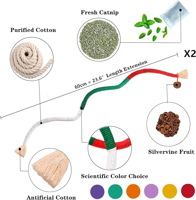- 1. [Mix-Cat Toys for Meet all Needs]:Package included:1 x catnip bag + 2 x 23.6”Cat catnip rope toys + 2*catnip coating sticks + 2*silvervine fruit coating sticks + 2* silvervine actinidia coating sticks + 1*cat silvervine with lafite grass + 1*cat silvervine with black feather + 1*cat silvervine with yellow feather + 1* cat silvervine with colorful feather.Cat chew toys for indoor cats is suitable for cats of all ages & breeds, relaxation for every stage of life. No wire inside, safe to use