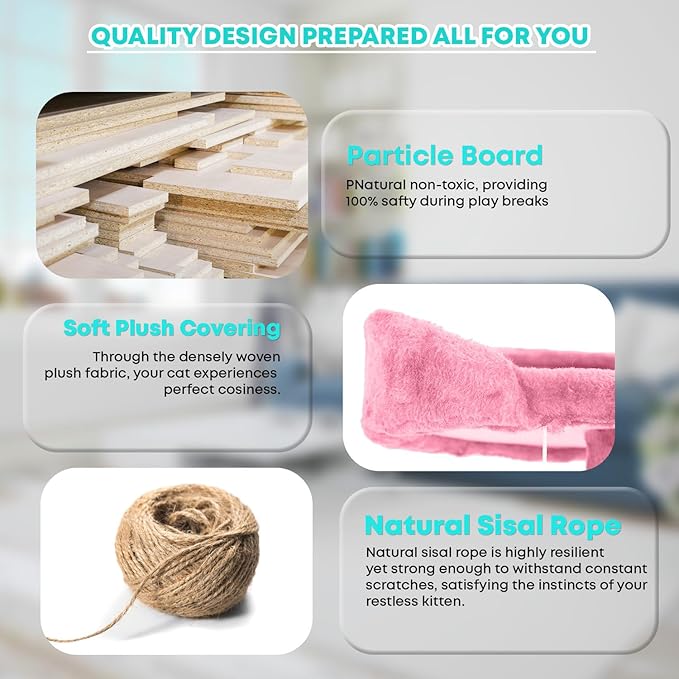 • 🐱 【Posts for Scratching Covered in Sisal 】These are scratching surfaces that are integrated into the framework. Cats love to bury their claws in sisal because it's a sturdy substance with a coarse texture. Our cat tree promotes healthy scratching habits and helps discourage cats from damaging furniture by offering dedicated spaces for them to scratch.