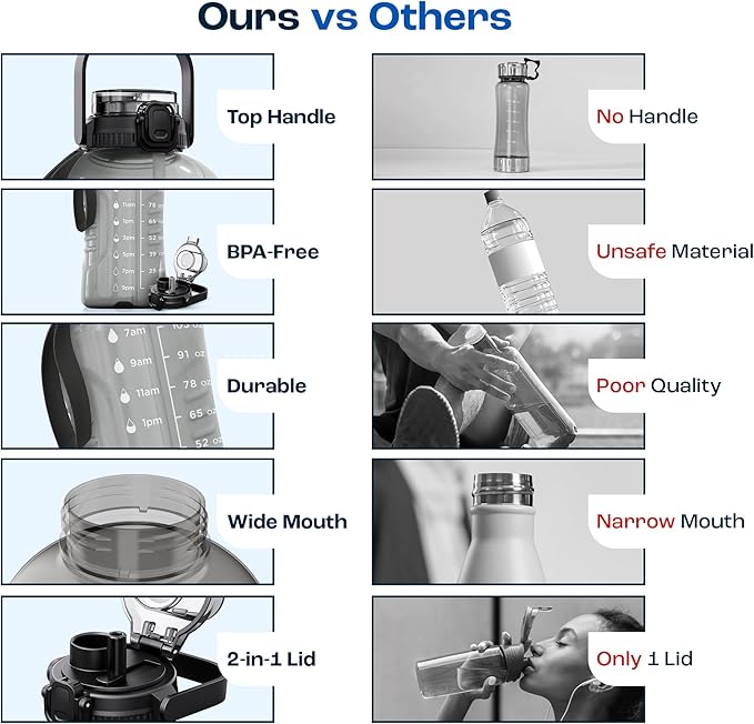 - 2-in-1 Chug & Straw Lid - Our one-gallon water jug comes with a dual functionality lid that allows you to chug or sip without having to change the lid. The smart, off-centre placement of the lid lets you use both the spouts with ease - sip while you work and chug after a rigorous workout!