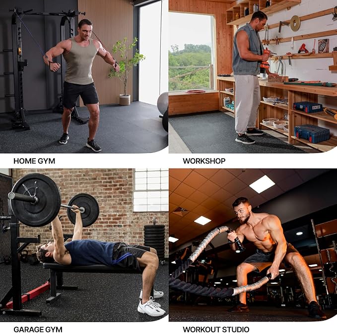 - [Sturdy Rubber Build]: Crafted from premium recycled rubber, our gym mats handle intense workouts with ease. These resilient tiles effortlessly support heavy machinery, providing reliable floor protection against scratches, scuffs, and dents from weights, dumbbells, medicine balls, jump ropes, and other workout gear in a home gym.