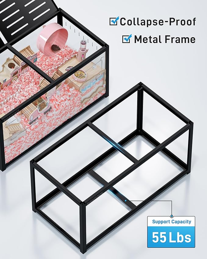 - 【Chew-proof & Sturdy Hamster Tank】Made with thickened clear acrylic panels and a chew-proof metal frame, this dwarf hamster cage is perfect for keeping your little escape artist safe. Four clear-view windows allow you to easily spot your pet at any time.