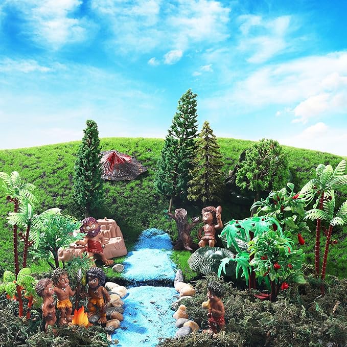 - Prehistoric Man Diorama Supplies: package includes 6 miniature people figurines, 7 different types of tree stump volcano lamp accessories, 11 Mixed Model Trees or plastic trees, 1 bag of blue sand, 1 bag of stones and 1 bag of 50g green moss; Nice combination to meet your needs, very suitable for building a primitive theme school project