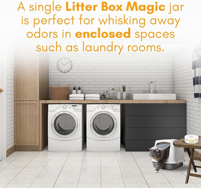 - MAXIMUM STRENGTH & LONG-LASTING – 30 DAYS ODOR FREE! Our cat box deodorizer pro-grade strength formula delivers powerful litter box odor control for 30 days, even in multi-cat households. Twist open the cat litter scent deodorizer jar and let it go to work—perfect for bathrooms, closets, enclosed basements, and small, poorly ventilated areas. With its continuous odor-fighting power, enjoy 30 days of effective odor elimination. Let our product keep your home smelling clean and Odor-free!