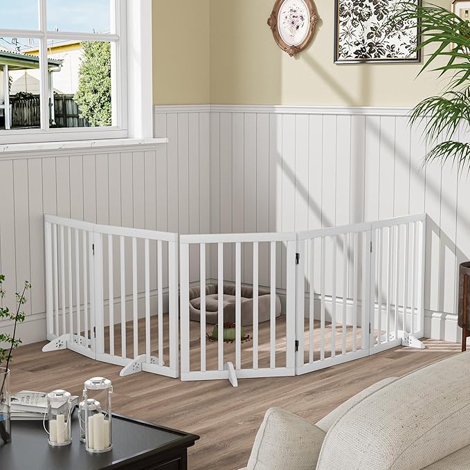 - Stable and Durability: This freestanding pet gates for dogs is designed with an attractive white surface and sturdy non-slip rubber bottom dots that are very stable and strong when used with the support feet, and will not cause potential damage to your home. This versatile dog gate indoor is a pet enclosure, room divider, and dog gates all in one to meet all aspects of your scenario!
