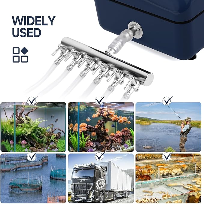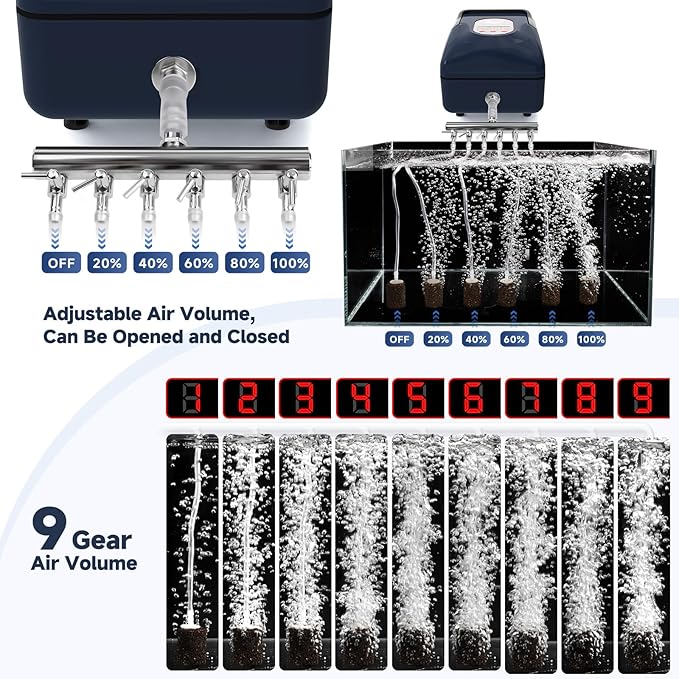 - Complete Accessories: Included in the package, 1*air pump, 1*main air pipe, 2*check valve, 1*outlet manifold, 6*air stone, 1*39ft air tube, 1*adapter, We are also giving away 2 extra bubble stones