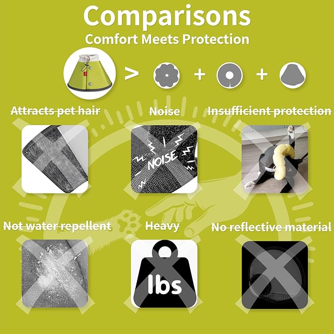 - 【Soft & Lightweight】 Crafted with internal EVA material and Rib Fabric, our cone collar weighs just 1.9 ounces—lighter than the weight of an egg. This lightweight design ensures dogs sleep comfortably without feeling burdened or restricted around their necks. Plus, the soft cone collar provides excellent rebound near walls or furniture, ensuring your pet's safety without emitting loud noises