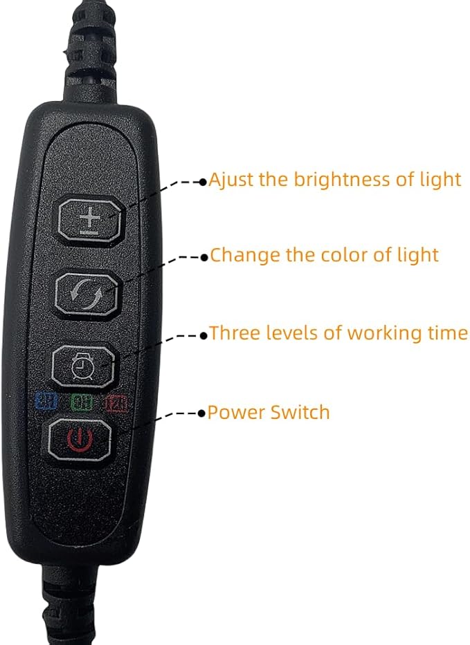 - π Three colors to choose: The circle button is the switch to change light colors from any one of white, yellow and yellow-white. And the add & subtract button is the switch to adjust the brightness of light.